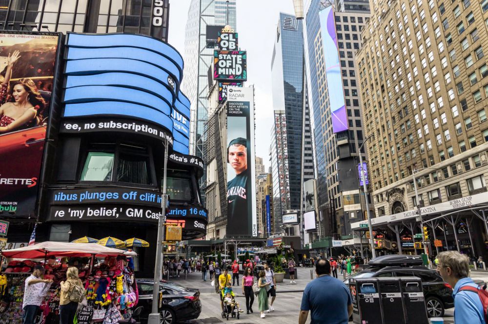 Ora la sua immagine appare su un grande schermo che celebra i 10 nuovi talenti a livello globale di Spotify “Radar” a Times Square a New York.